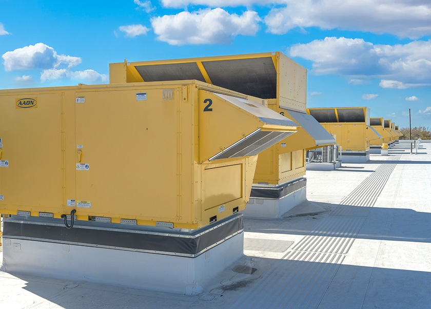 To meet the project’s performance and comfort requirements, thirteen (13) new AAON rooftop units were selected, featuring: Modulating cooling and gas-fired heating for precise temperature and humidity control, Factory-mounted DDC controls to optimize energy efficiency and enhance occupant comfort. High-efficiency filtration and a built-in air purification system for superior indoor air quality. A custom “school bus yellow” exterior finish to align with the school’s branding. Additionally, H.C. Nye provided custom acoustical isolation curbs to ensure quieter operation and support an improved classroom learning environment.